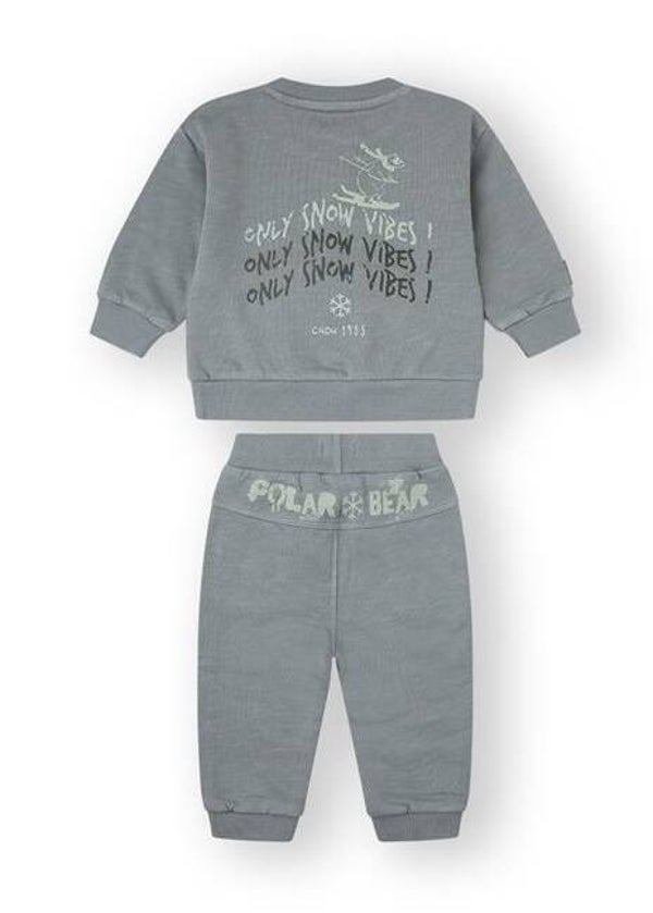 Un conjunto práctico y cómodo en tono gris azulado, compuesto por sudadera de manga larga con bolsillo tipo canguro y detalle estampado en el pecho. El pantalón estilo jogger a juego cuenta con cintura elástica ajustable con cordón, bolsillos laterales y bajos con puño, garantizando un ajuste perfecto.