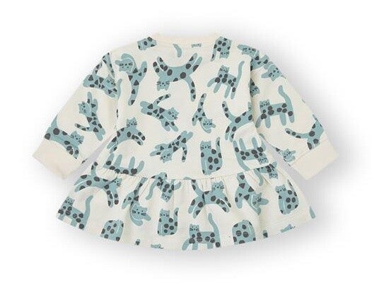 Un vestido cómodo y divertido en color crudo con estampado integral de simpáticos gatitos en tonos azules. Presenta cuello redondo, manga larga y corte a la cintura con pequeño lazo decorativo al frente, que aporta un detalle coqueto y encantador.