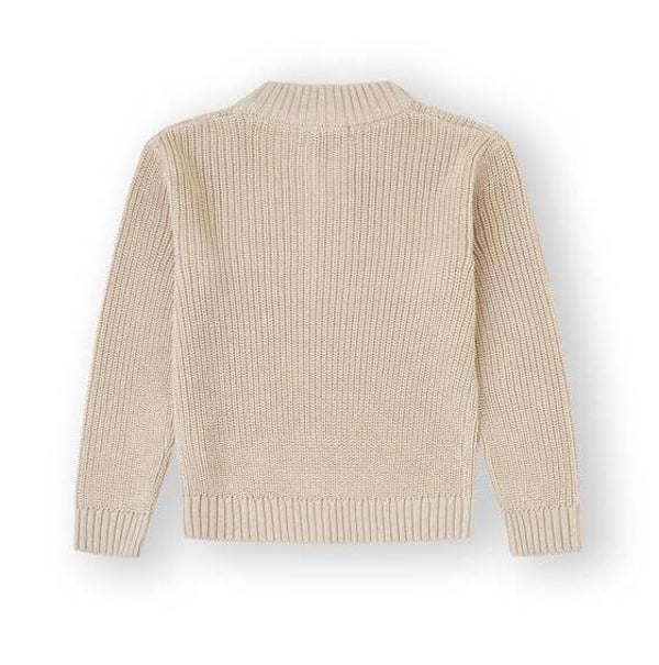 Jersey en punto grueso color beige, con cuello subido y media cremallera frontal para mayor comodidad. Puños y bajo acanalados para un mejor ajuste y detalle de etiqueta decorativa en el bajo.