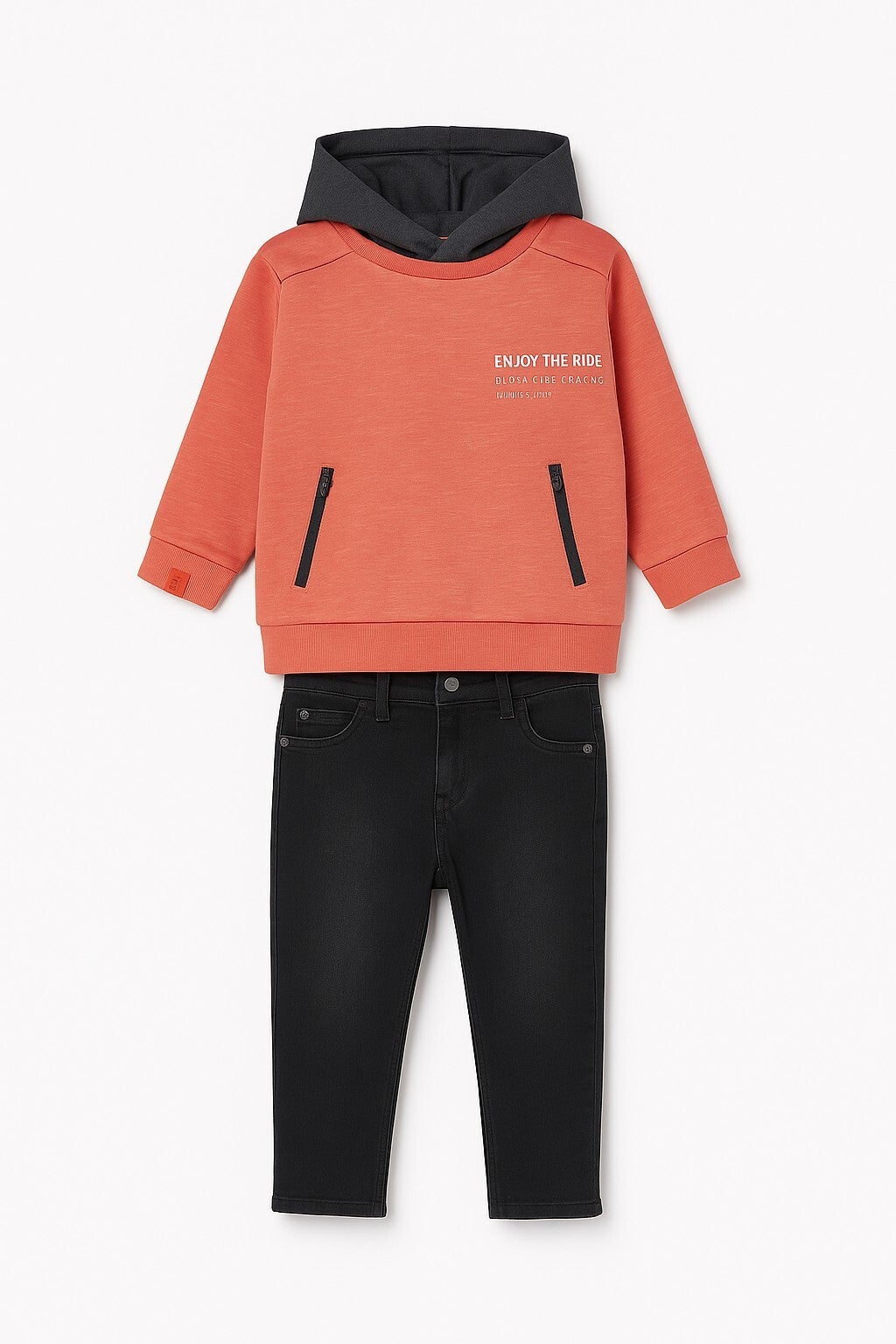Conjunto cómodo y moderno compuesto por sudadera de manga larga en color coral con capucha interior en contraste, bolsillos decorativos con cremallera y detalle de mensaje en el pecho “Enjoy the Ride”. Se acompaña de un pantalón denim en color negro con cintura elástica para un ajuste perfecto.