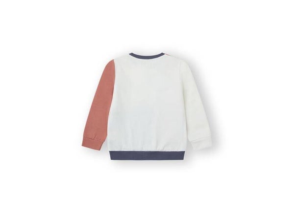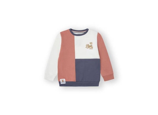 Conjunto moderno y práctico compuesto por sudadera de manga larga en bloques de color (blanco, coral y azul marino) con detalle bordado en el pecho y etiqueta decorativa en el bajo. Se combina con un pantalón tipo cargo en azul marino, con bolsillos laterales y cintura elástica ajustable con cordón.
