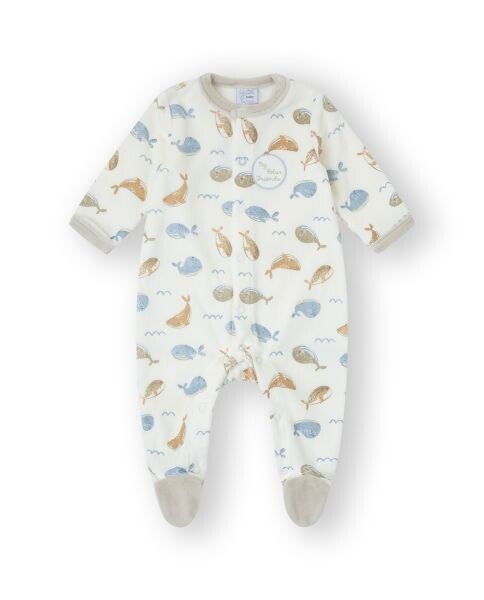 Pijama entero en tejido aterciopelado y suave al tacto. Diseño estampado con ballenas en tonos beige y azul. Incluye pies cubiertos, cierre delantero con automáticos y detalle bordado con la frase “My favorite friends”, ideal para mayor comodidad y abrigo.