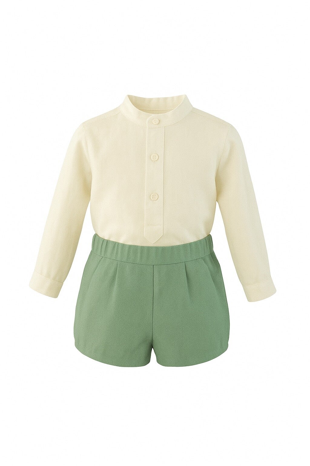 Compuesto de una camisa en tono crudo con cuello mao, pantalón corto en too verde con cintura elástica par aun ajuste cómodo y delicados pliegues que aportan un acabado pulido.
