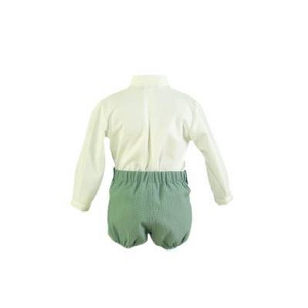 Frescura y estilo para los días más especiales. Camisa blanca con detalles finos y pantalón corto en verde. Comodidad y elegancia en un conjunto perfecto para celebrar.